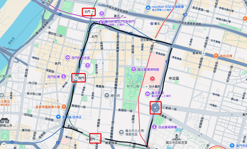 三線道路は現在の中山南路、愛国西路、中華路に当たります(北門から善導寺にかけて東に続く道路は忠孝西路)